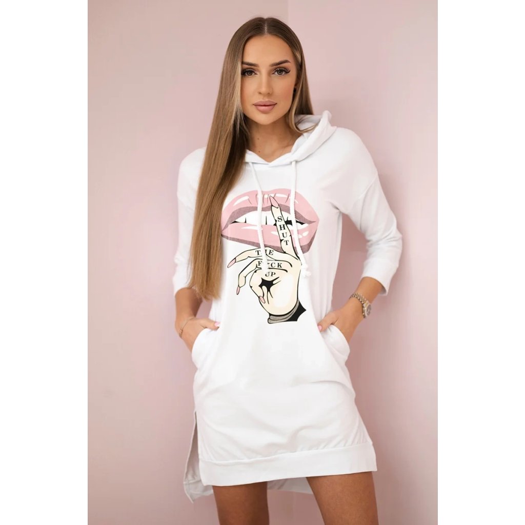 Predstavujeme vám pohodlné šaty. Šaty s kapucňou, majú módnu farebnú potlač. Šaty s dlhšou zadnou časťou. Veľmi zaujímavá ponuka pre všetky dámy. Šaty sú vyrobené z vysokokvalitného materiálu. Veľkosť je univerzálna a bude vhodná pre dámy nosiace veľkosť S, M alebo L.