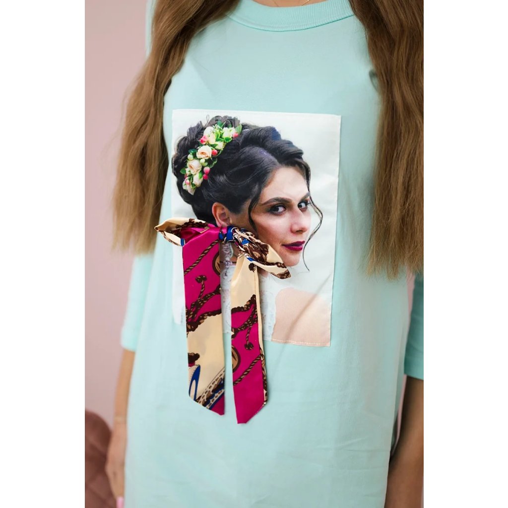 Šaty s grafikou a farebnou 3D mašľou mätová