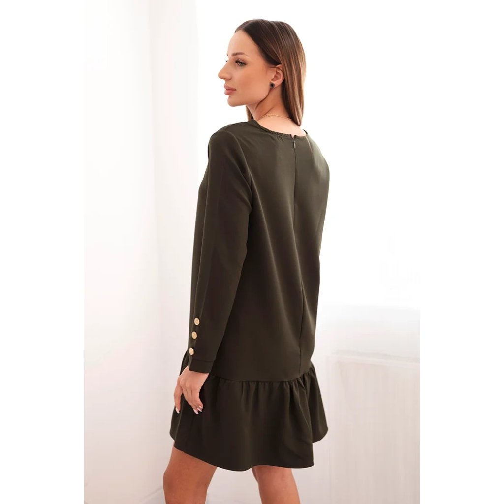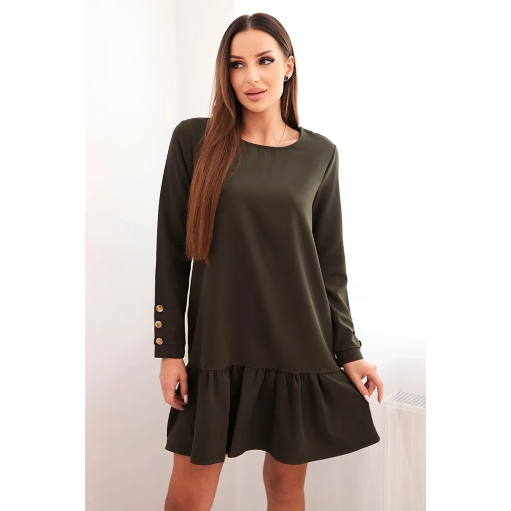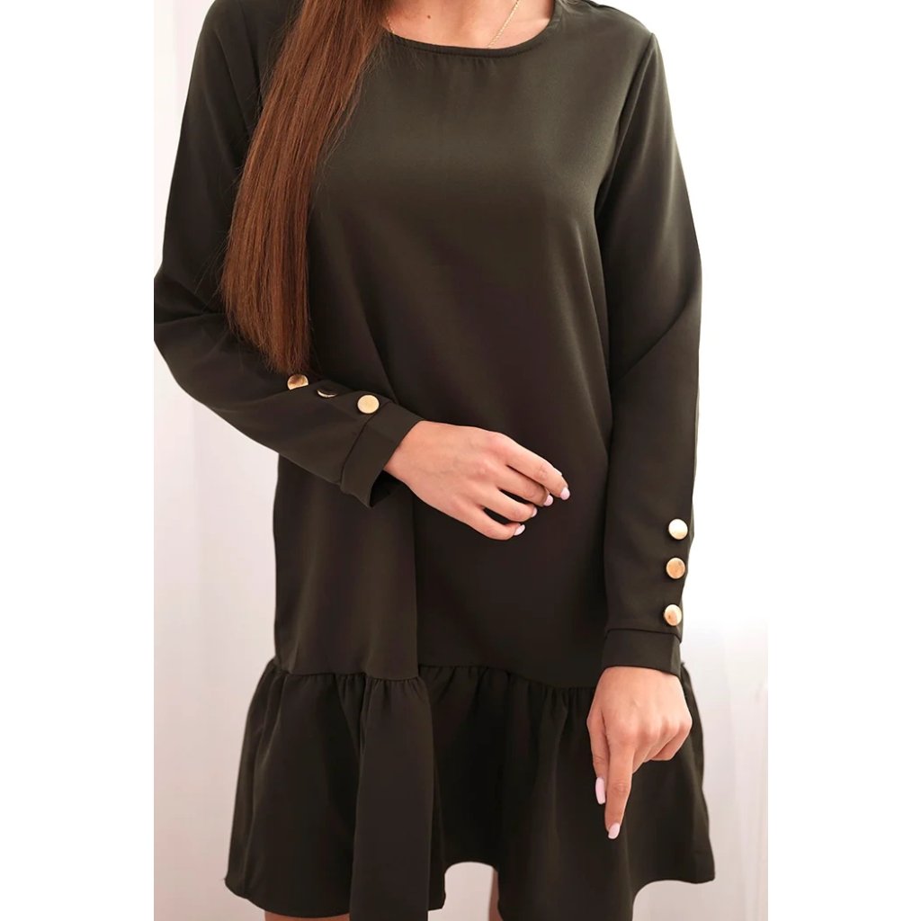 Predstavujeme vám elegantné šaty. Šaty s volánom. Šaty s dlhým rukávom, na rukáve ozdobné zlaté gombíky. Šaty sú vyrobené z vysokokvalitného materiálu. Veľkosť je univerzálna a bude vhodná pre ženy s veľkosťou S, M alebo L.