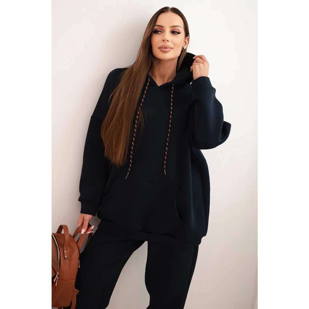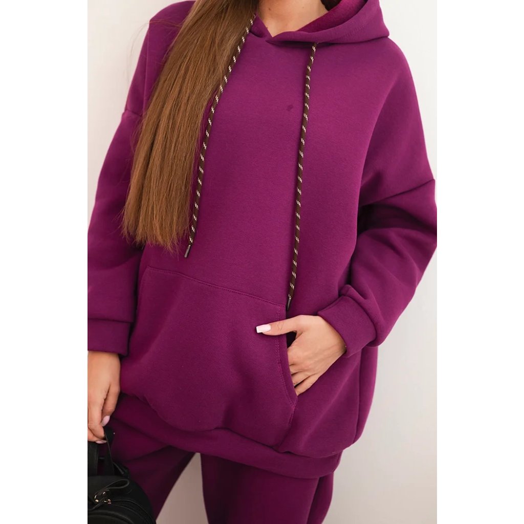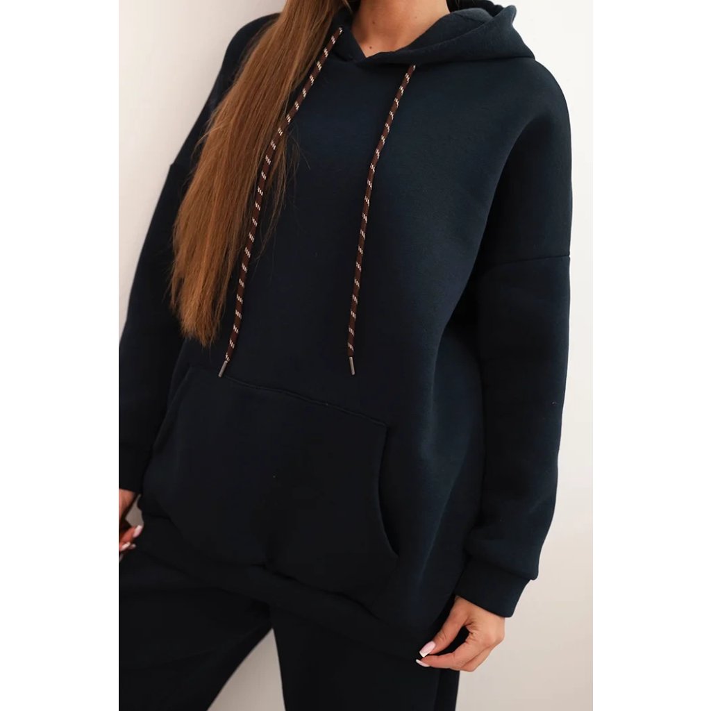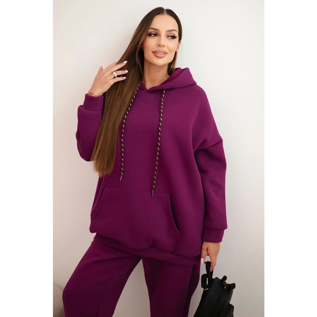Pohodlná dámska súprava vyrobená z príjemnej bavlnenej látky je ideálnou voľbou na každodenné nosenie. Mikina s objemnou kapucňou, nastaviteľnými šnúrkami a klasickým klokankovým vreckom zabezpečuje pohodlie a voľnosť pohybu. Nohavice s elastickým pásom a sťahovacími manžetami na nohaviciach sa dokonale prispôsobia postave a zaručujú pohodlie po celý deň.