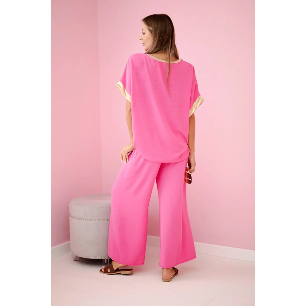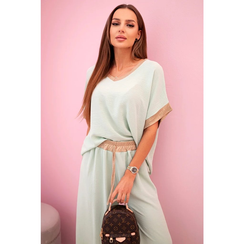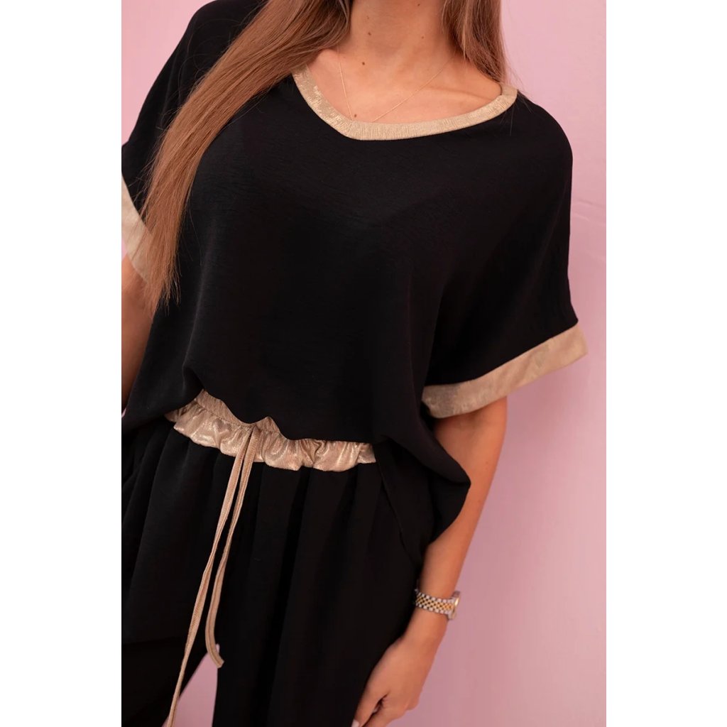 Tento výnimočný komplet je spojením pohodlia a elegantného štýlu, ideálne pre ženy, ktoré si cenia jemné, ale efektívne akcenty. Vyrobený z ľahkej, vzdušnej viskózy, zaručuje maximálny komfort nosenia po celý deň. Jemná tkanina krásne sedí na postave, zdôrazňujúc jej prirodzené prednosti. Zlaté lemovanie dodáva celku výnimočný, luxusný charakter, priťahujúc pohľad a pridávajúc eleganciu štýlu. Vďaka tomu je tento komplet skvelý na každodenné nosenie aj na formálnejšie príležitosti. Môžeš ho nosiť s obľúbenými doplnkami, vytvárajúc unikátne štýly prispôsobené tvojmu štýlu. Stav na komplet z viskózy so zlatým lemovaním a cíť sa elegantne a štýlovo v každej situácii. Veľkosť je univerzálna a bude vhodná pre dámy vo veľkosti S, M alebo L.