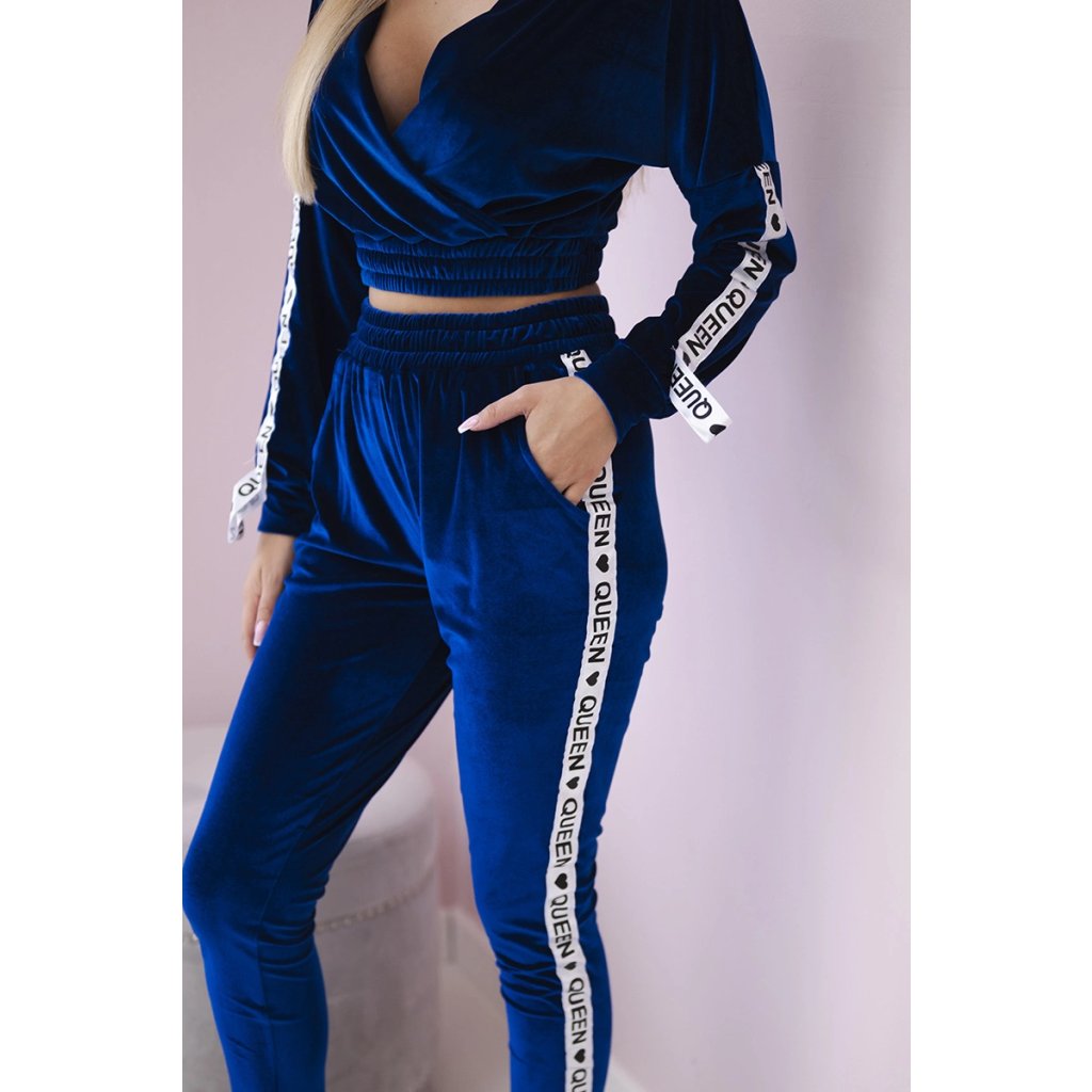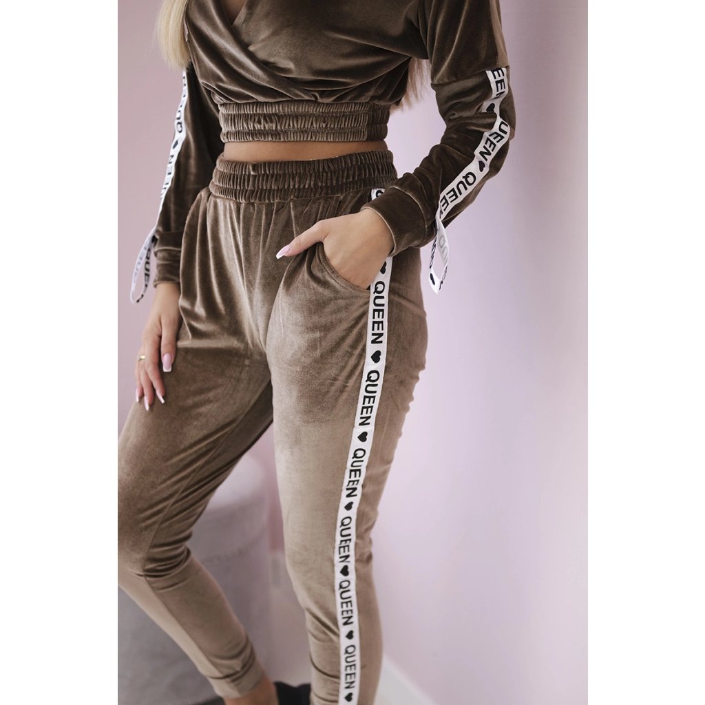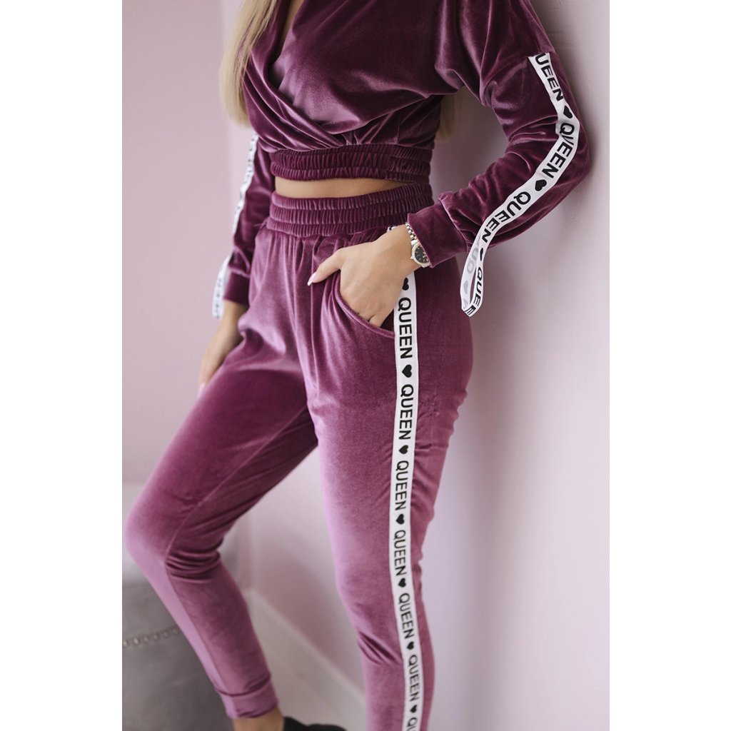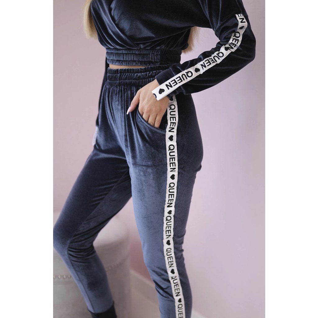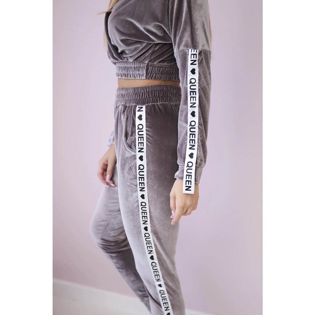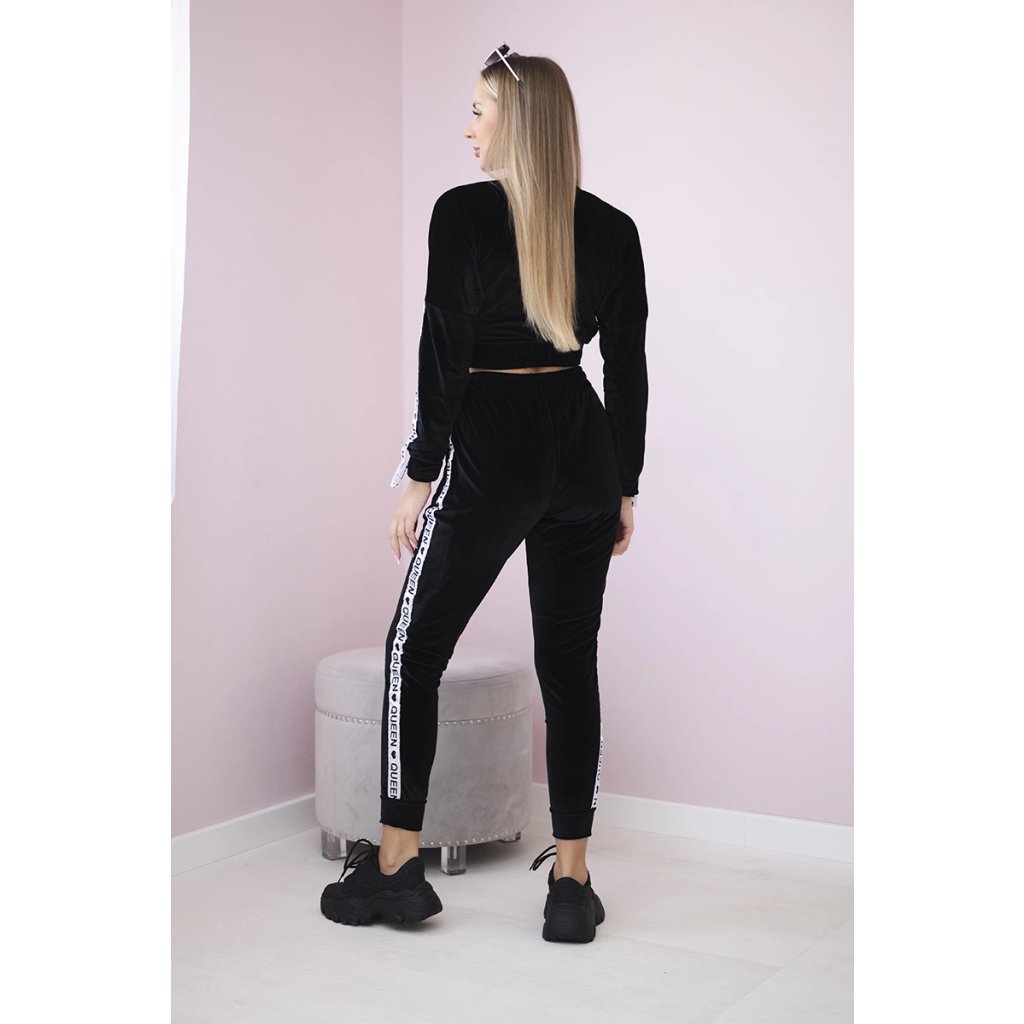 Predstavujeme vám komplet mikiny a nohavíc. Komplet vyrobený z velúru. Mikina s výstrihom. Na ramenách ozdobná páska s nápisom. Na spodnej časti mikiny je našitá guma. Nohavice s vreckami a páskou na nohaviciach. Veľmi módny a štýlový komplet. Komplet je vyrobený z vysoko kvalitného materiálu. Veľkosť je univerzálna a bude vhodná pre dámy vo veľkosti S, M alebo L.