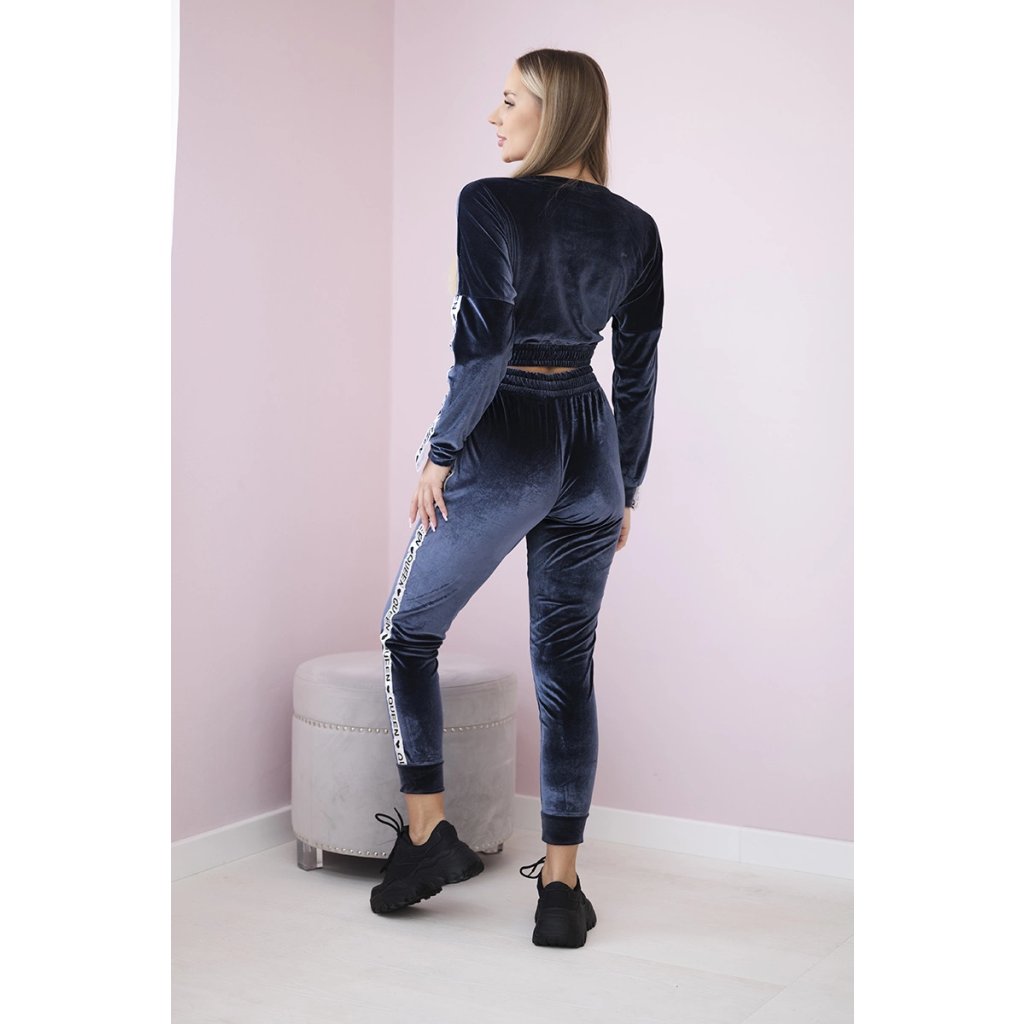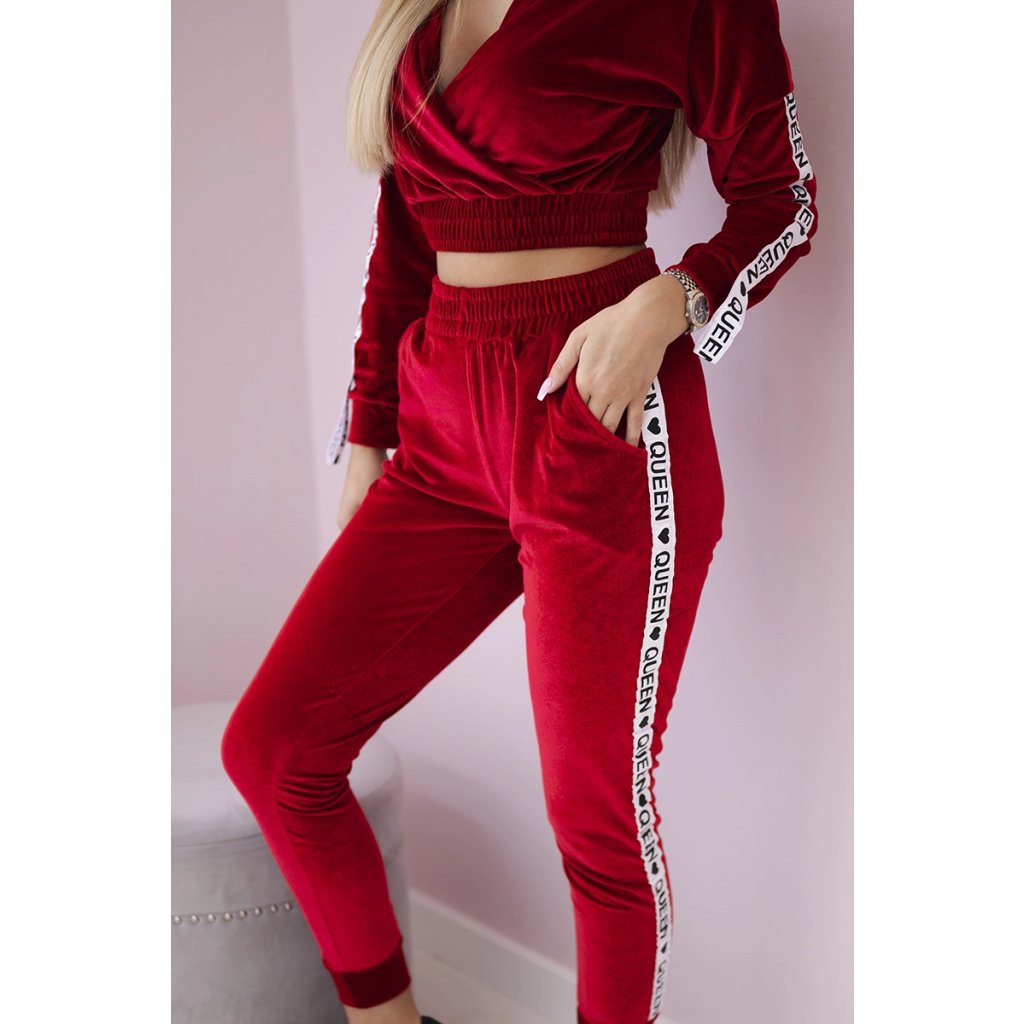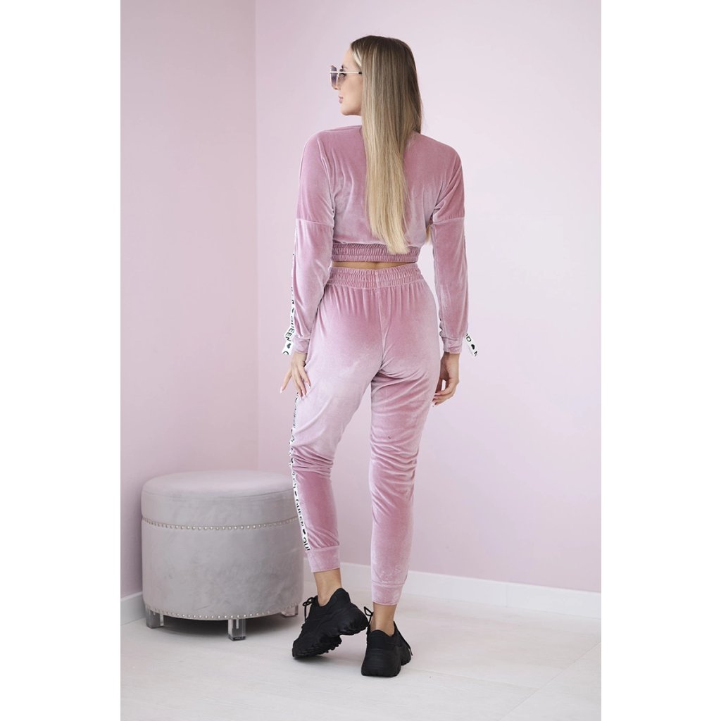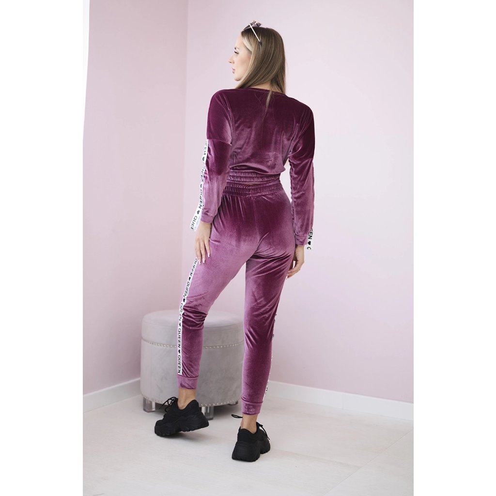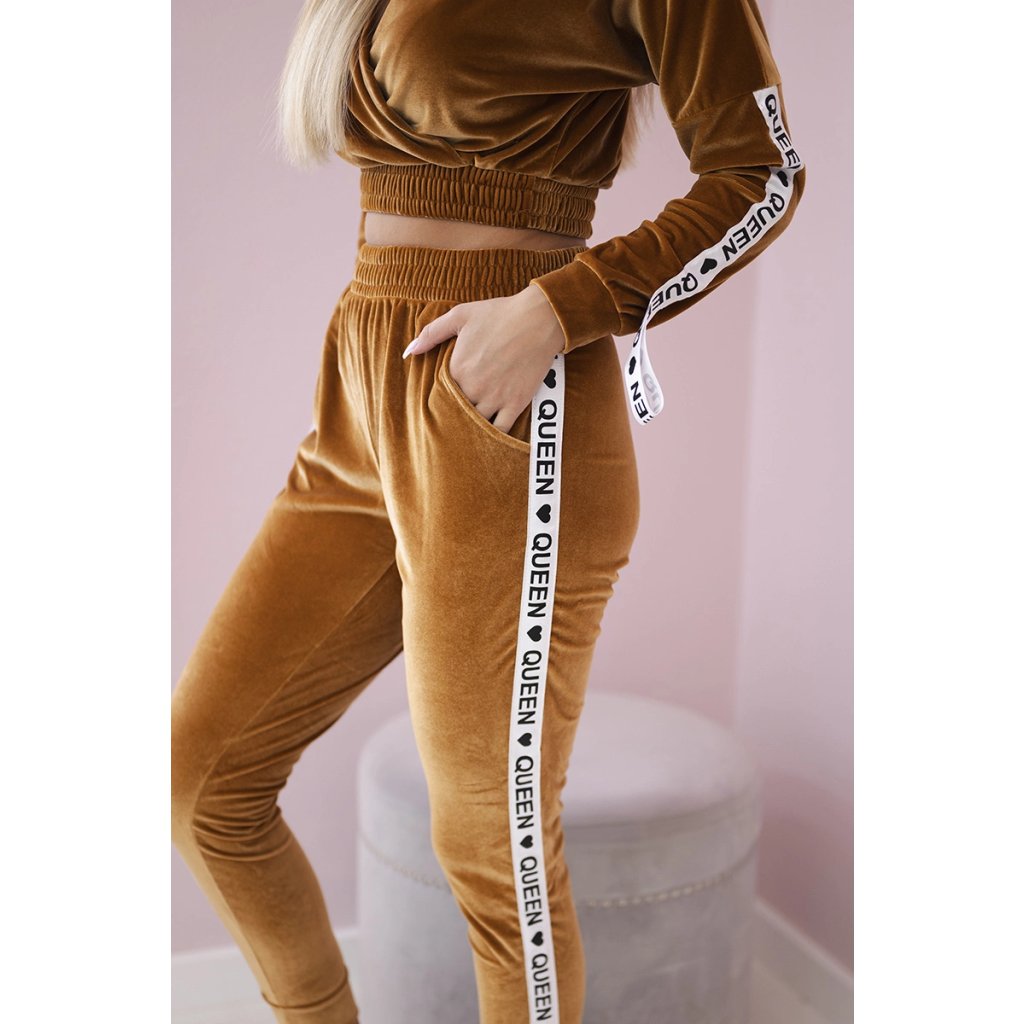 Predstavujeme vám komplet mikiny a nohavíc. Komplet vyrobený z velúru. Mikina s výstrihom. Na ramenách ozdobná páska s nápisom. Na spodnej časti mikiny je našitá guma. Nohavice s vreckami a páskou na nohaviciach. Veľmi módny a štýlový komplet. Komplet je vyrobený z vysoko kvalitného materiálu. Veľkosť je univerzálna a bude vhodná pre dámy vo veľkosti S, M alebo L.