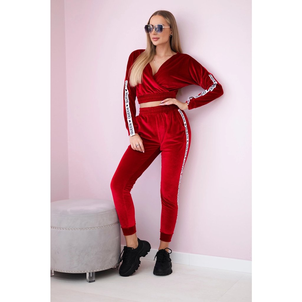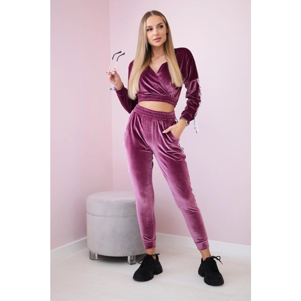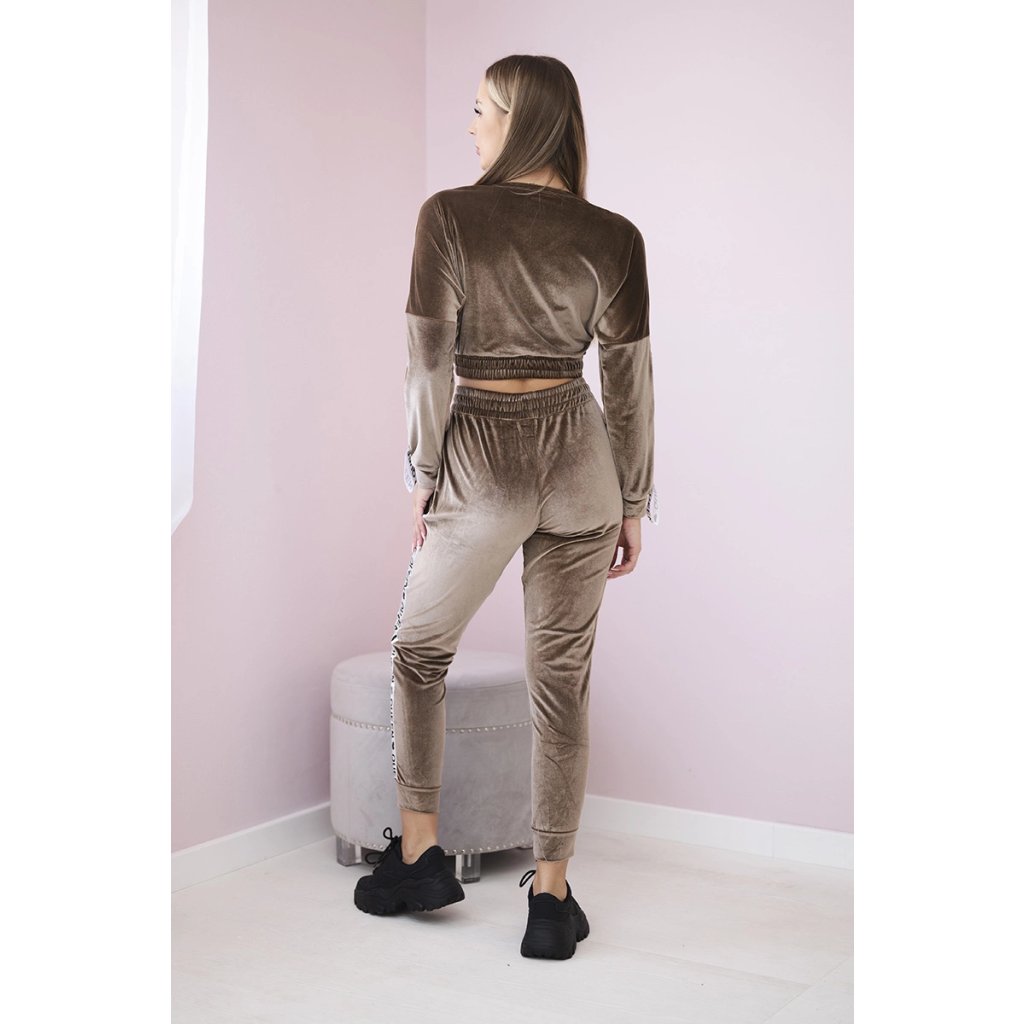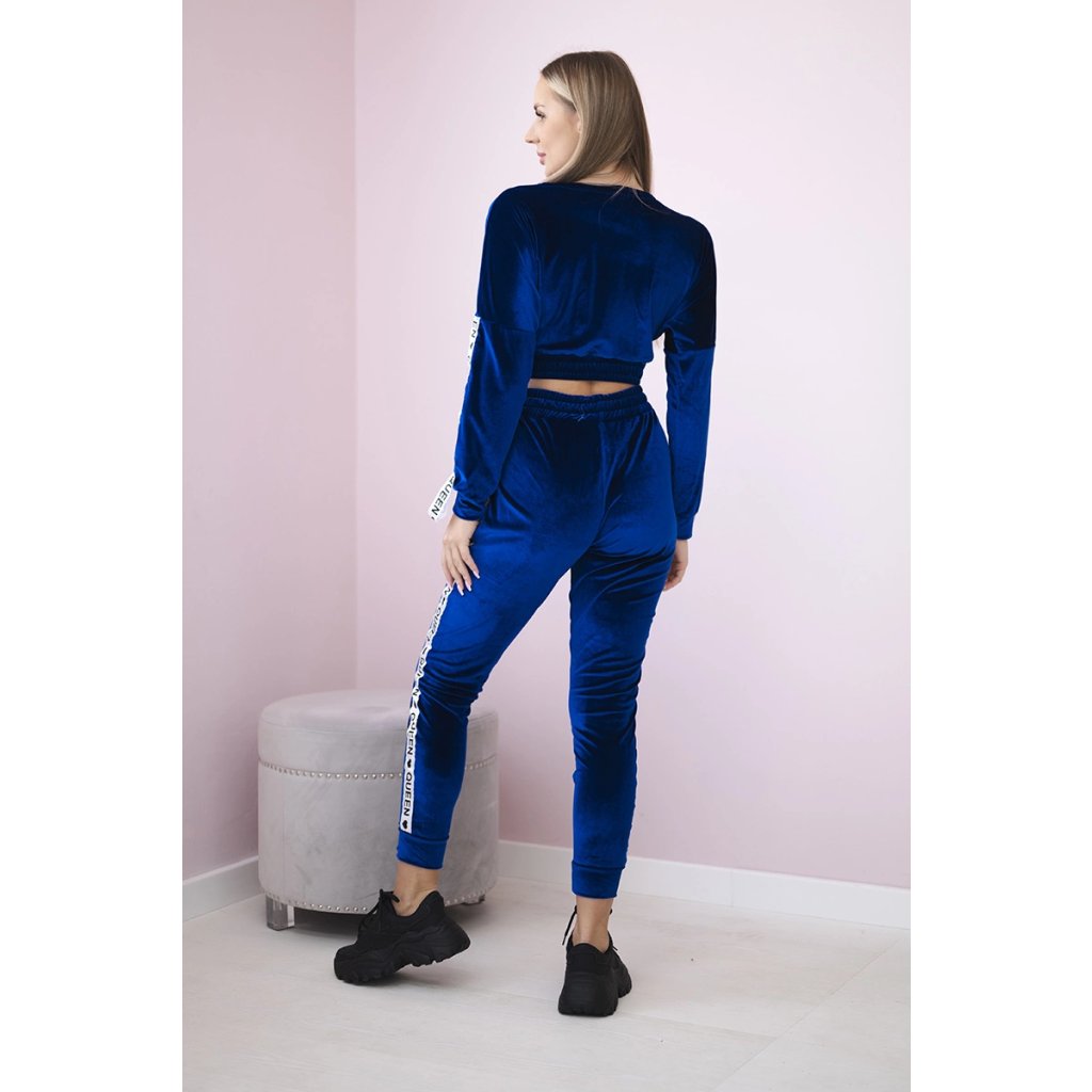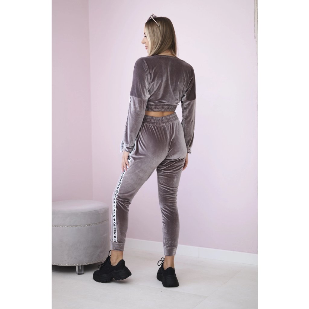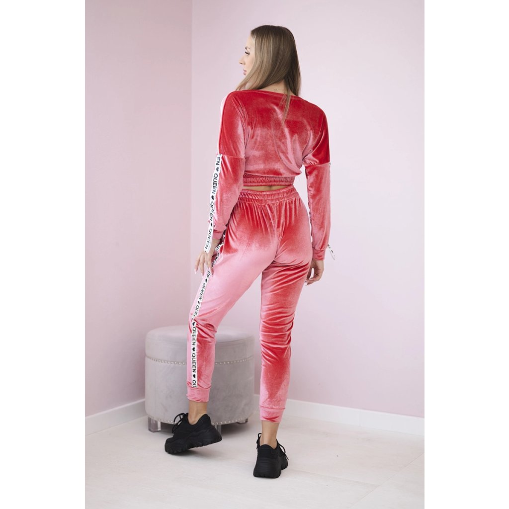Predstavujeme vám komplet mikiny a nohavíc. Komplet vyrobený z velúru. Mikina s výstrihom. Na ramenách ozdobná páska s nápisom. Na spodnej časti mikiny je našitá guma. Nohavice s vreckami a páskou na nohaviciach. Veľmi módny a štýlový komplet. Komplet je vyrobený z vysoko kvalitného materiálu. Veľkosť je univerzálna a bude vhodná pre dámy vo veľkosti S, M alebo L.