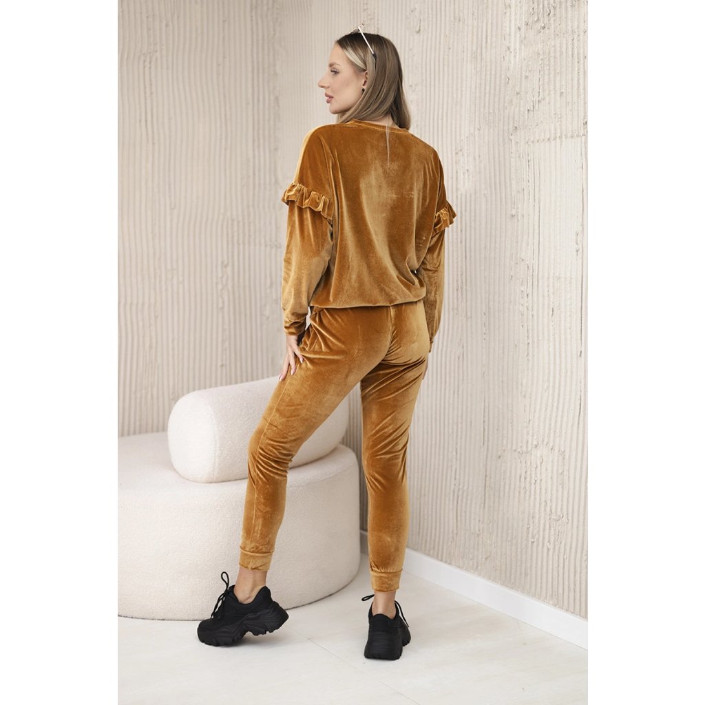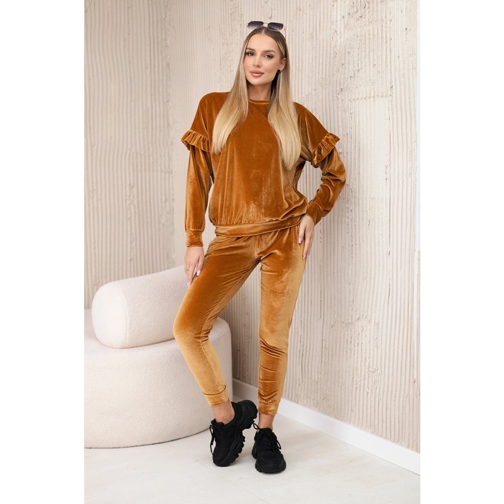Velúrový komplet s volánikmi v ťavej farbe